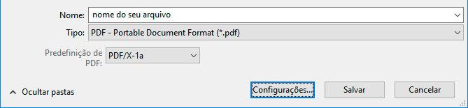 Informe o nome para o seu arquivo e escolha a predefinição PDF/X-1a e clique em Configurações.